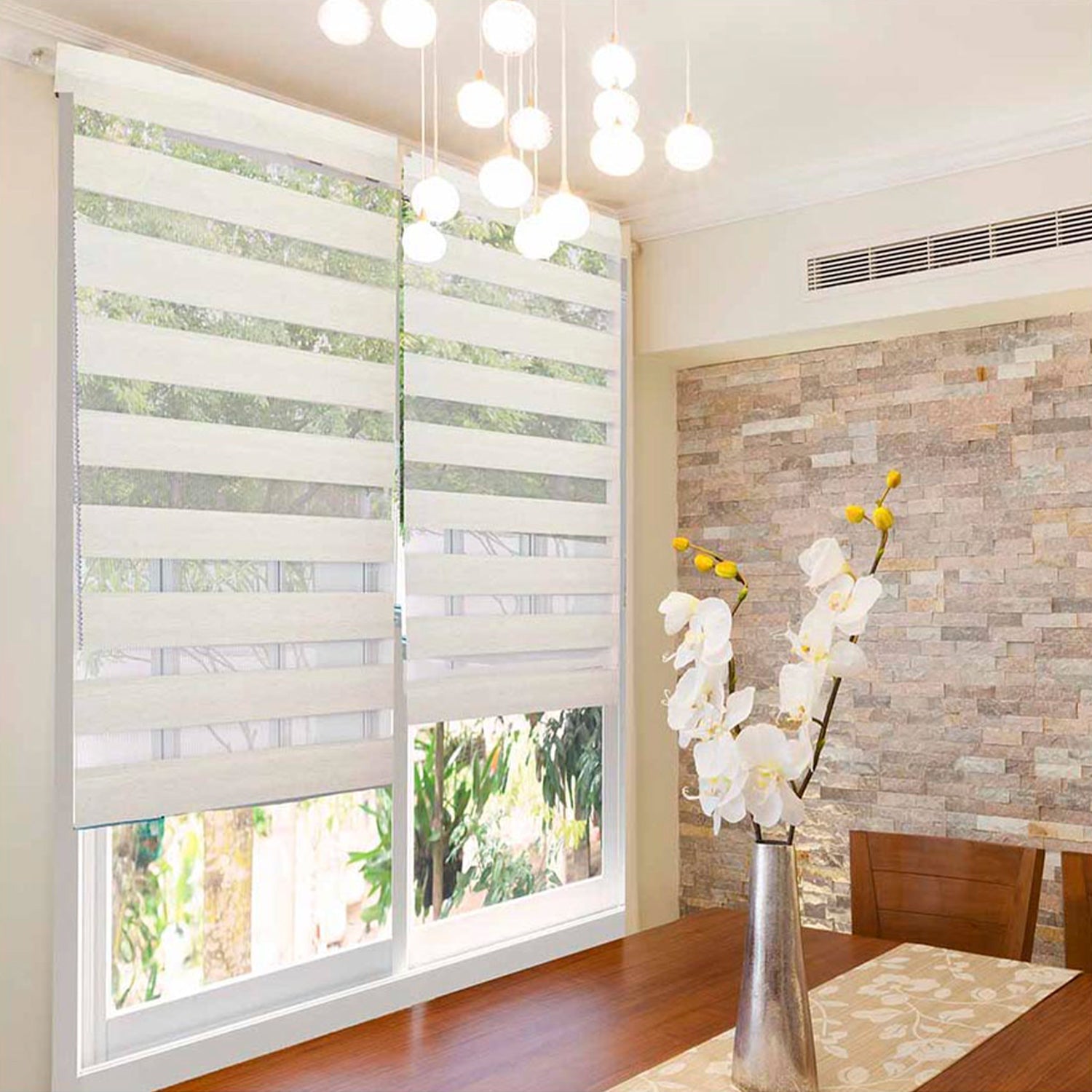 Estas prácticas cortinas aportan privacidad y control de la luz a cualquier habitación. Su tejido bloquea parcialmente la visión hacia el exterior mientras deja pasar la luminosidad de forma suave.Su diseño clásico las hace versátiles: quedarán bien en dormitorios, salas de estar e incluso cocinas. • Composición: 100% poliéster• Material: Poliéster de alta calidad• Función: Control de luz y privacidad• Sistema de instalación: Enrrollable con sistema roller para fijación a pared o techo• modelo: Day/Night• Control de luz: Regula el paso de luz de forma gradual desde la total privacidad hasta dejar pasar toda la luminosidad de forma uniforme.• Instalación: Fácil e intuitiva, sin necesidad de taladrar• Limpieza: Fácil con paño húmedo• Durabilidad: Alta, el material poliéster es resistente y no se decolora• Medidas: 150x230 cm