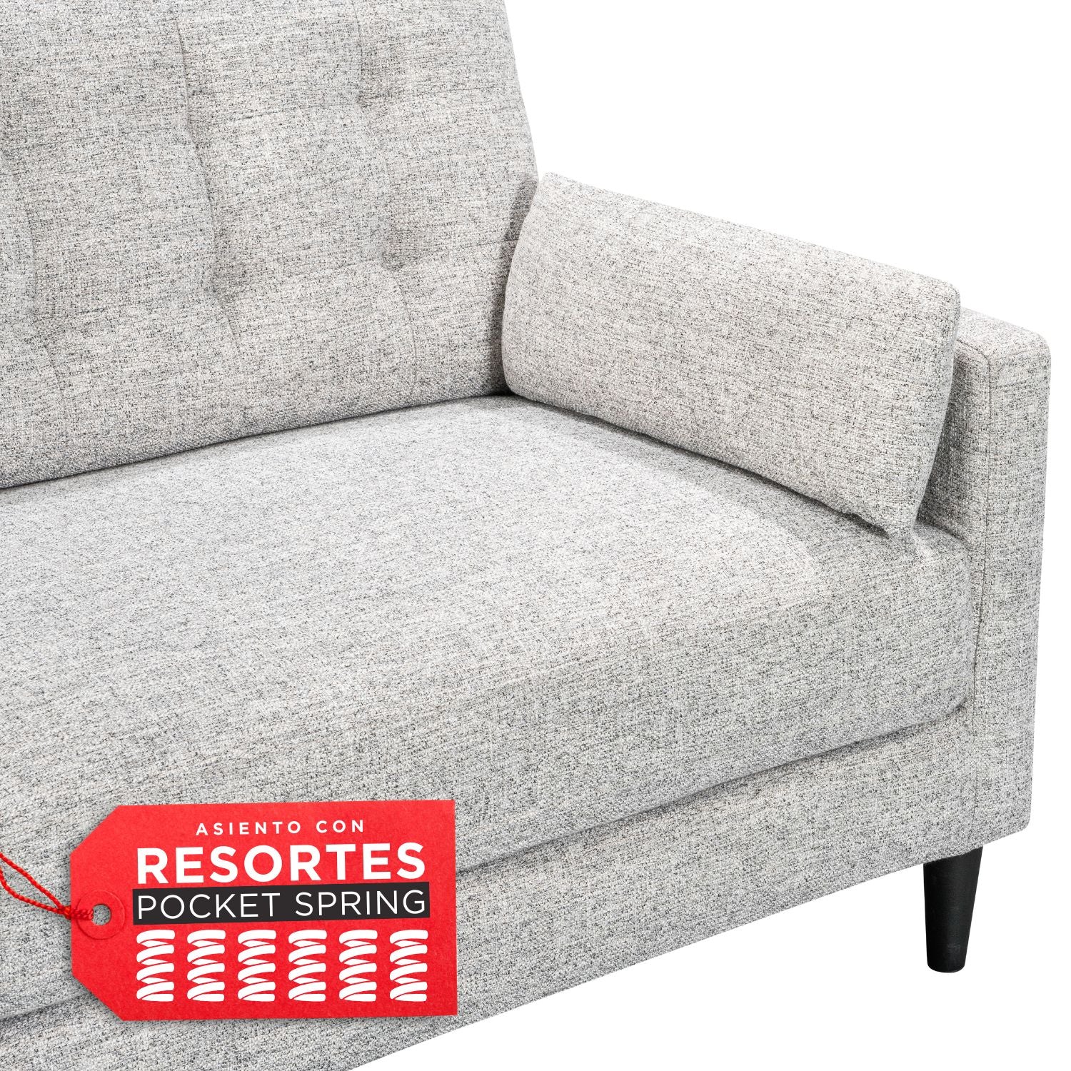 Tapizado en color gris, este sofá aporta luz, amplitud visual y un aire elegante a cualquier ambiente. Su interior está compuesto por una base de resortes pocket spring y espuma de alta densidad, que brindan soporte firme, adaptabilidad y resistencia al uso diario.